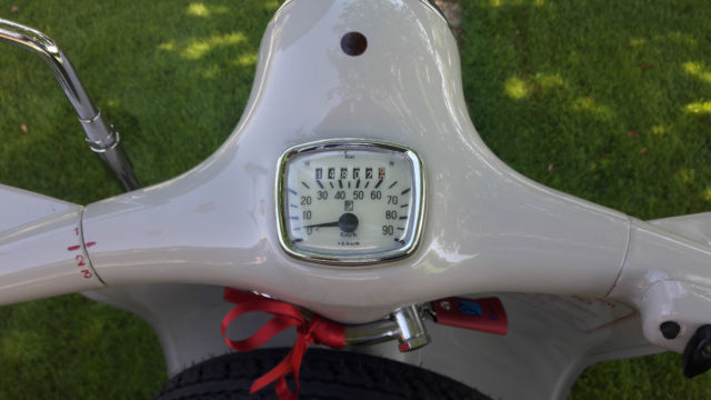 uno del più bei manubri mai visti... Vespa 125 VNA del 1958 con contachilomteri, accessorio dell'epoca, ma uno specchietto allora non previsto e fissato grazie ad una particolare staffa sagomata, alla vite blocca manubrio