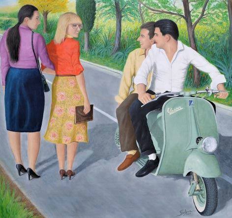 Disegno d'epoca con ragazzi in Vespa... sempre attuale..