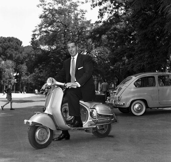 Joe di Maggio, campione di baseball ed ex marito di Marilyn Monroe, su una Vespa, icona cult della Dolce Vita (13 giugno 1957)