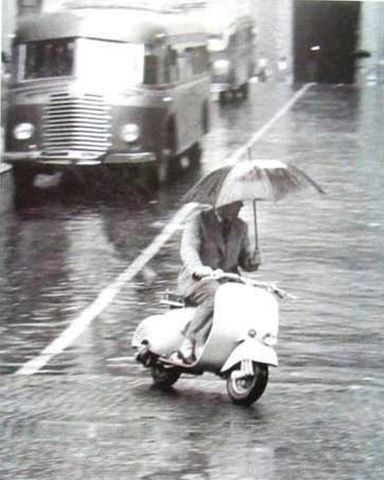 negli anni 50 nemmeno la pioggia fermava un vespista se munito di ombrello.. ma come riusciva a cambiare marcia non è dato sapere