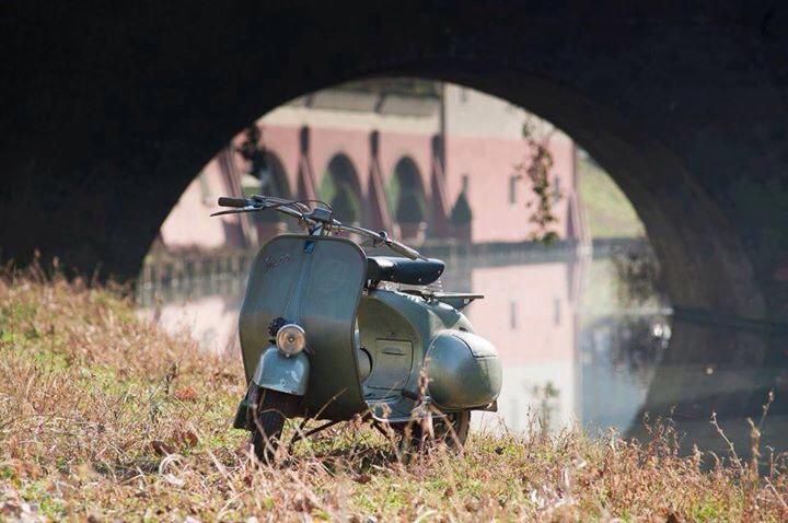 suggestiva immagine di Vespa faro-basso sulla riva di un canale all'ombra del ponte